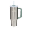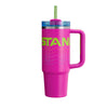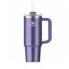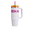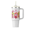 La tapa cuenta con una cubierta giratoria con tres posiciones: una abertura para sorber con pajilla, una boca ancha para beber y una tapa completa para evitar derrames. El tamaño más grande incluso se ajusta cómodamente en los portavasos de tu vehículo y viene con un asa resistente para llevar a todas partes.